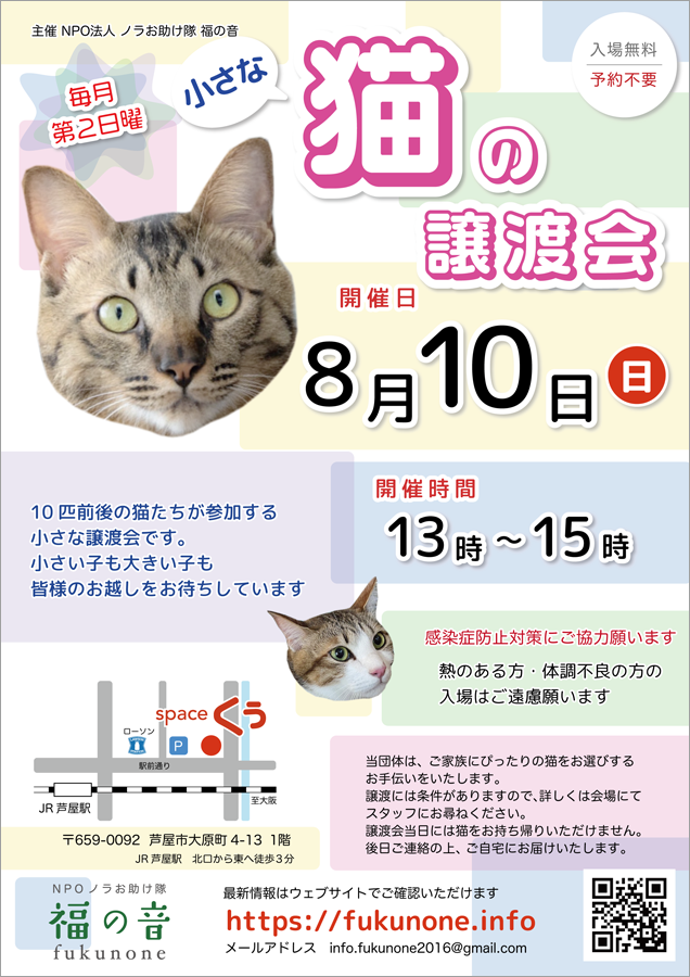 | 当譲渡会への猫のお持ち込みは一切受け付けておりません。 猫のお持ち込みに関わるお問い合わせへの返信は致しませんので、ご了承下さい。 |