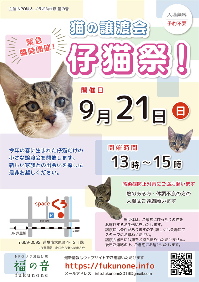 そのため、緊急で「猫の譲渡会 〜仔猫祭!」を開催いたします。